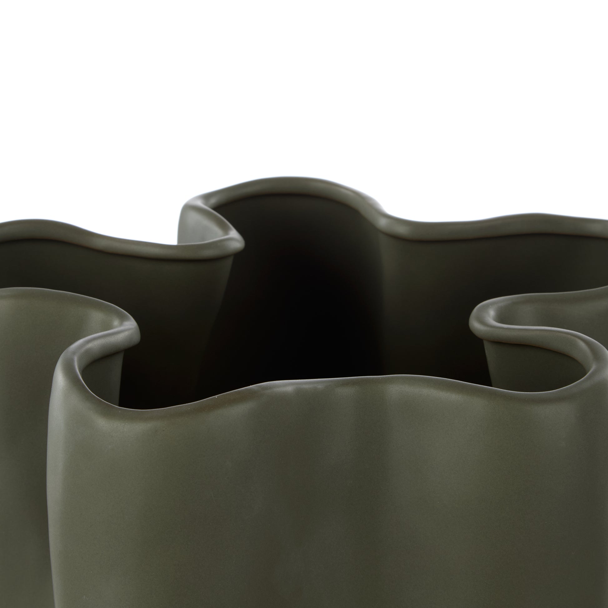 This Fluid Vase is crafted from stoneware in a burnt olive finish and a fluid wavy silhouette.