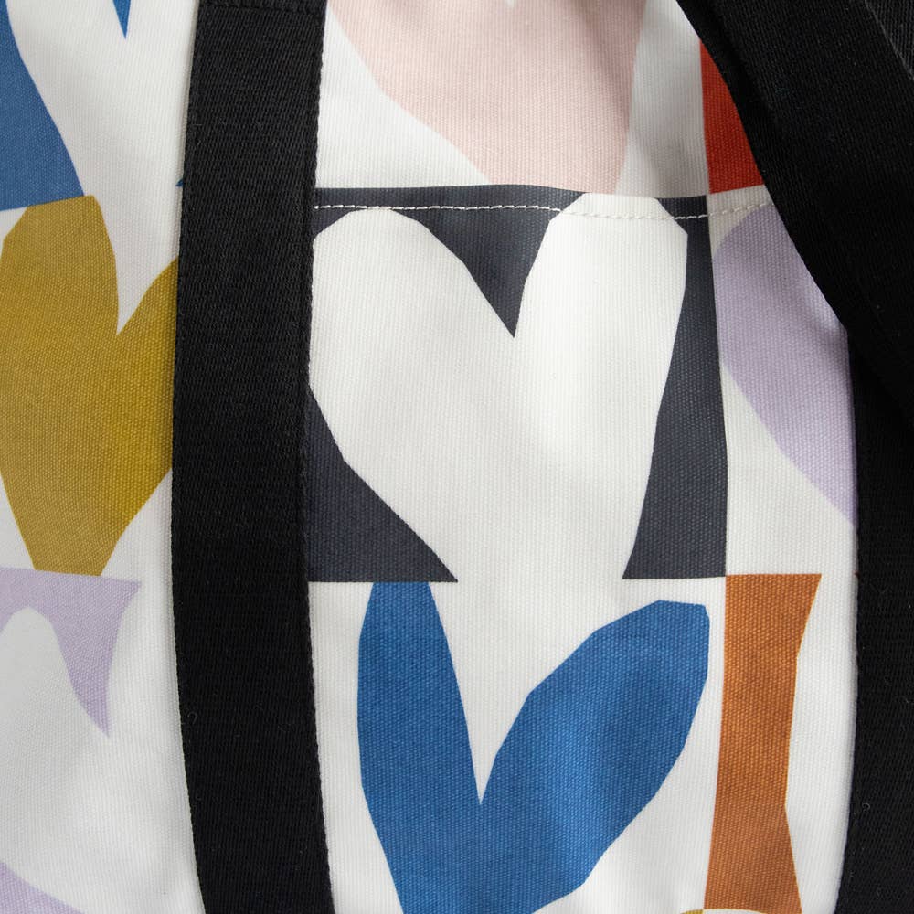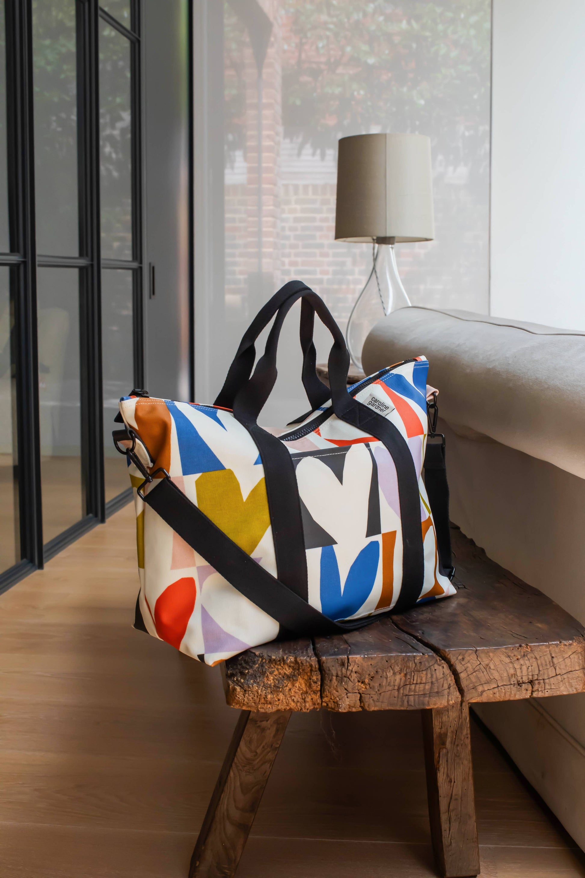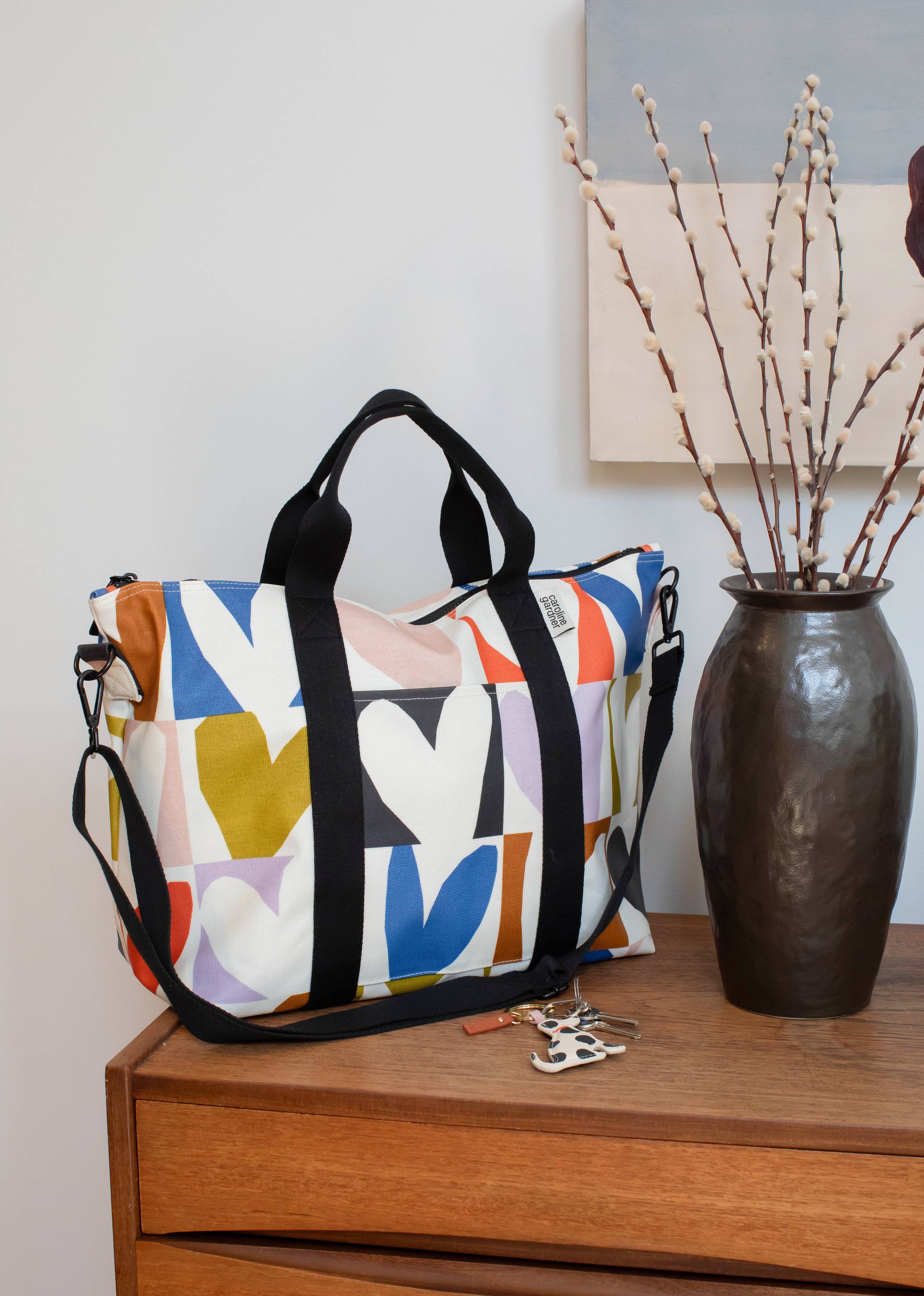 Matte coated cotton canvas bag in our new checkered heart print with zip closure, and a front pocket feature. With detachable strap over the shoulder in contrasting black is the perfect size for weekends away.