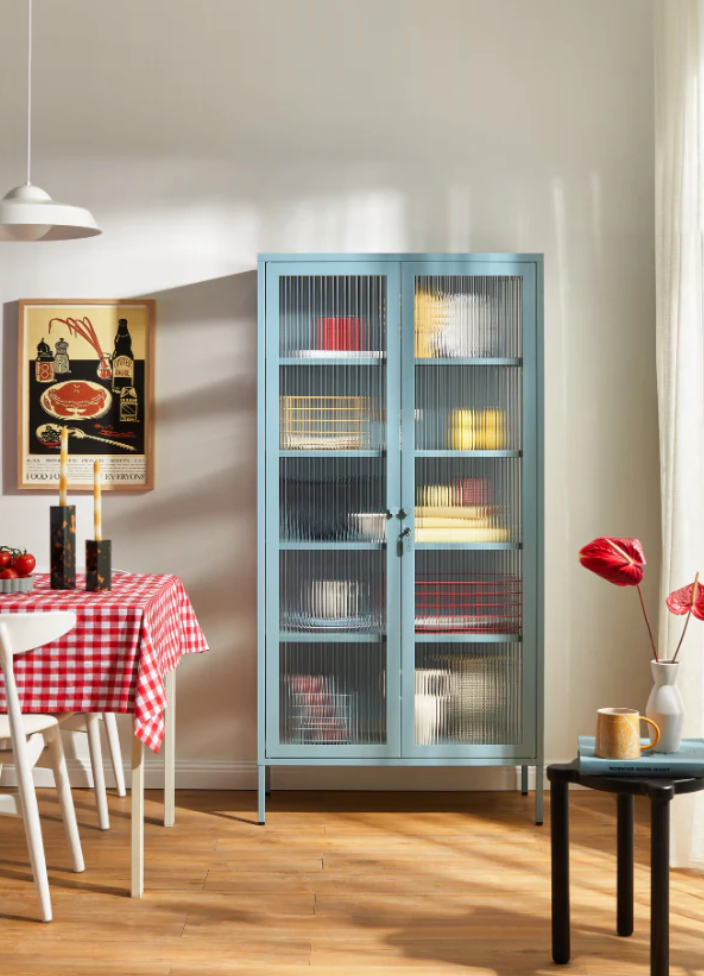 Got a thing for things? Curate your very own collection with our big, bold Collector. Fluted glass keeps your keepsakes safe, so you can protect your treasures while letting them shine. Pick your pop of colour, we'll bring the details: medallion handles, a custom enamel keyring and adjustable feet present your precious pieces in style.