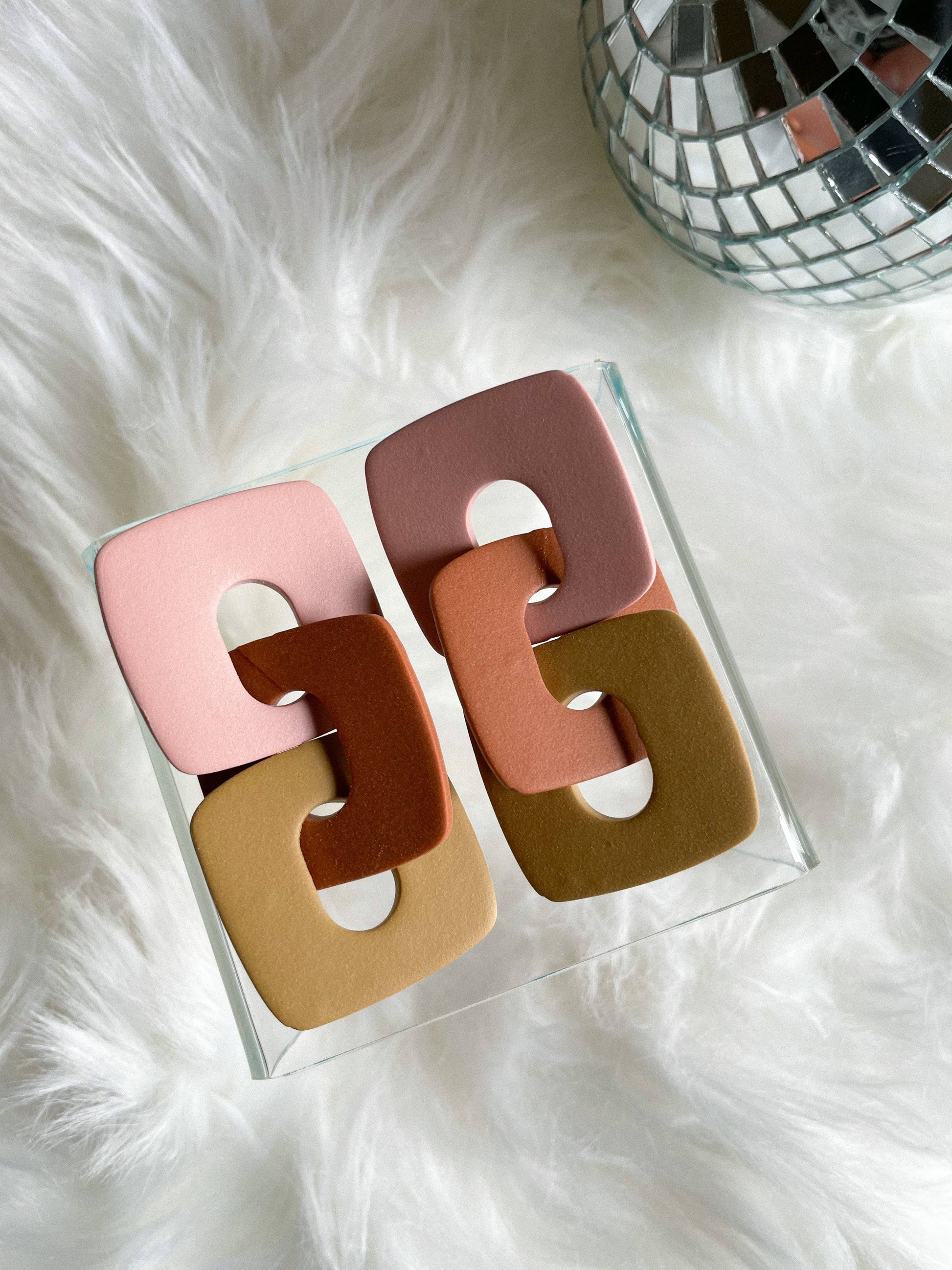A stunning statement and surprisingly lightweight. The retro squares link together to form a bold statement stud earring in vibrant, autumnal hues.