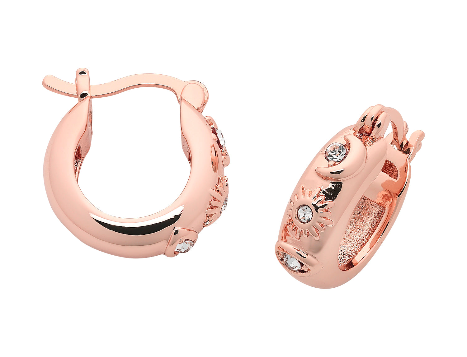 *Detailed mini hoops *1cm diameter *Finished with star, moon design *Clear crystal embellished *Microplated rose gold *Nickel free ^Your not so basic hoop with a cosmic touch. An on trend style you will reach for on repeat.