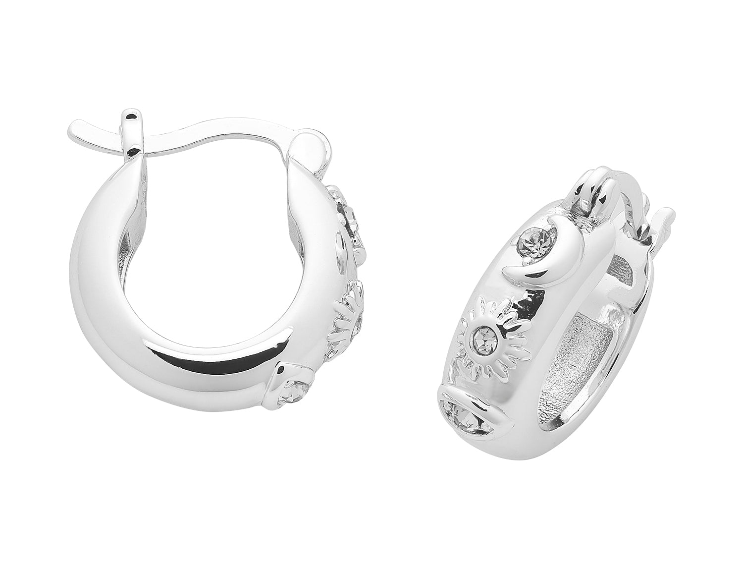 *Detailed mini hoops *1cm diameter *Finished with star, moon design *Clear crystal embellished *Microplated silver *Nickel free ^Your not so basic hoop with a cosmic touch. An on trend style you will reach for on repeat.